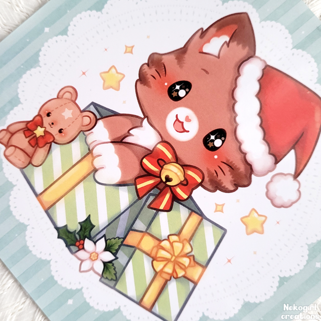 Impression sur une carte carrée d'un chat tout mignon, sur le thème de Noël. A offrir pendant les fêtes ou à garder pour soi-même ! ❄