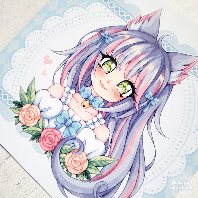 Print carrée de mon personnage original Mia, une fille chat pleine d'énergie. ♡
