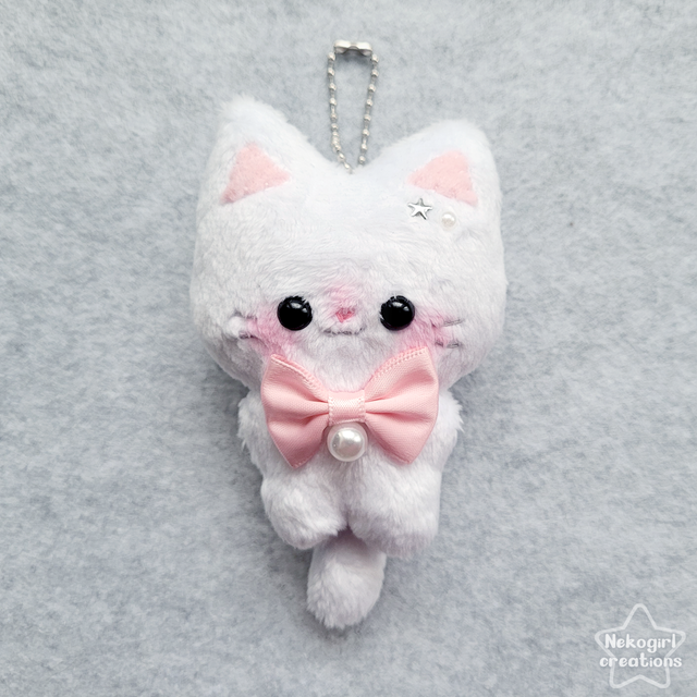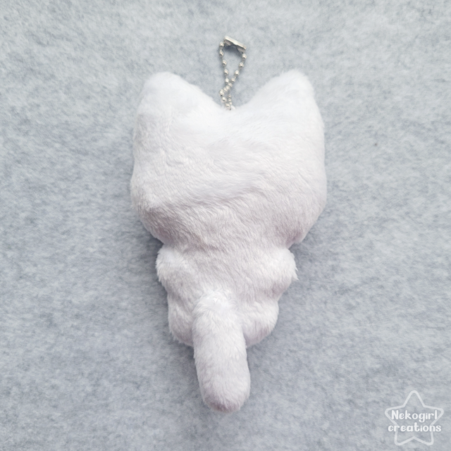 Petite peluche d’un chat blanc en tissu doux, designée par moi, entièrement faite et cousue à la main. ♡ Parfaite comme décoration unique sur un sac ou dans une chambre.