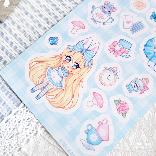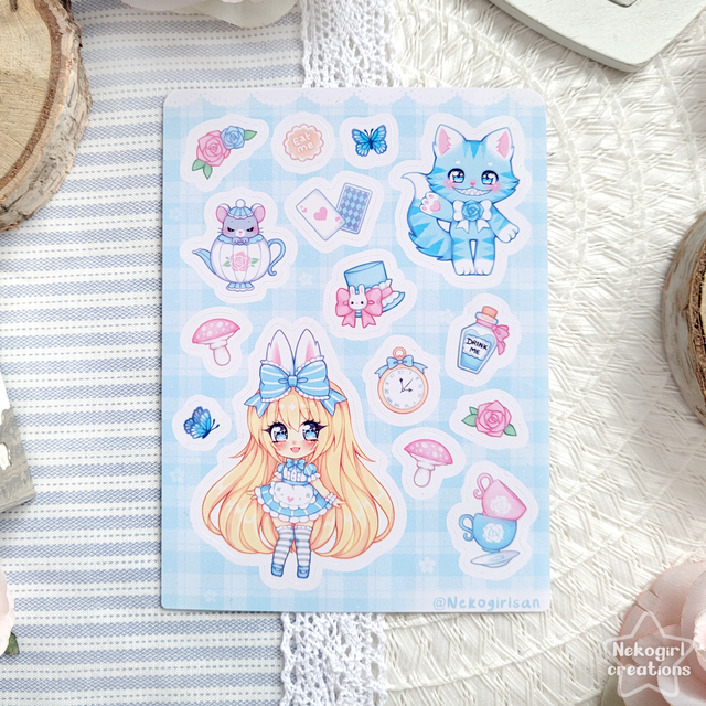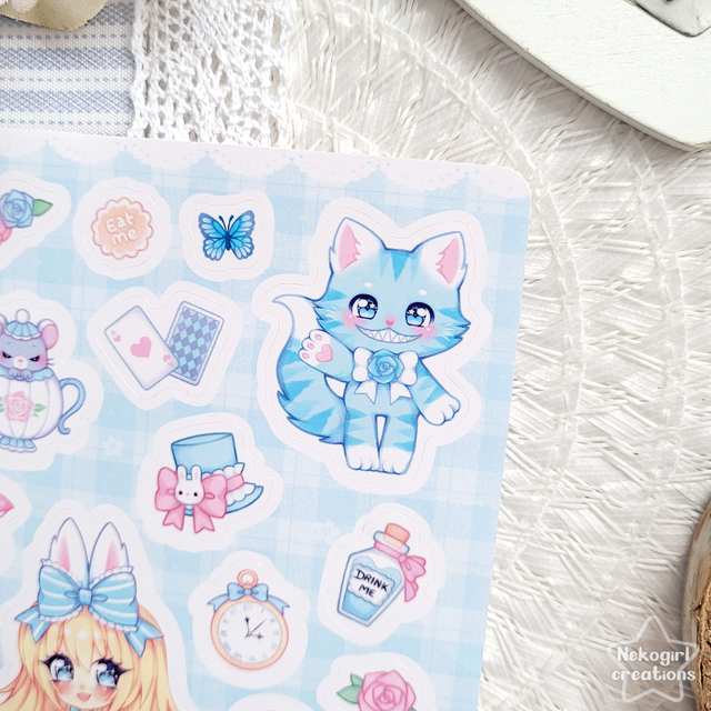 Feuille d'autocollants sur le thème d'Alice au Pays des merveilles. ♡ Il y a 15 autocollants en tout, ils sont résistants à l’eau et peuvent être utilisés pour décorer votre carnet, ou être collés sur n'importe quelle autre surface (ordinateur portable, téléphone, gourde, etc...) !
