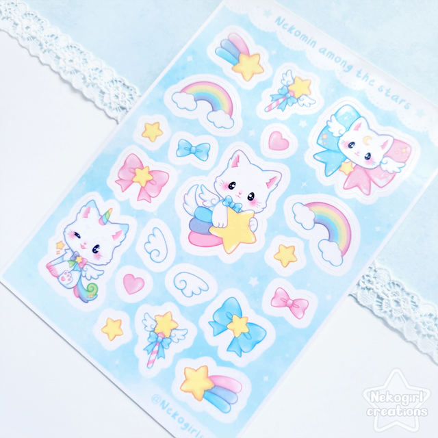 Feuille d'autocollants autour de ma mascotte, un petit chat blanc venu des étoiles, appelé Nekomin. ✰ Il y a 20 petits autocollants en tout ! Ils sont résistants à l’eau et peuvent être utilisés pour décorer un carnet, ou être collés sur n'importe quelle autre surface (ordinateur portable, téléphone, gourde, etc.) !