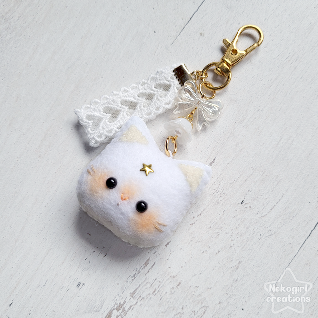Petit porte-clé en feutrine d’un chat blanc, designé par moi, entièrement fait et cousu à la main. ♡ Parfait pour accompagner vos clés, orner votre sac ou être accroché où vous le souhaitez.