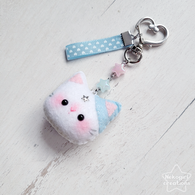 Petit porte-clé en feutrine d’un chat blanc et bleu, designé par moi, entièrement fait et cousu à la main. ♡ Parfait pour accompagner vos clés, orner votre sac ou être accroché où vous le souhaitez.