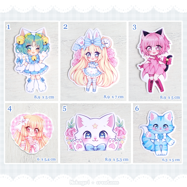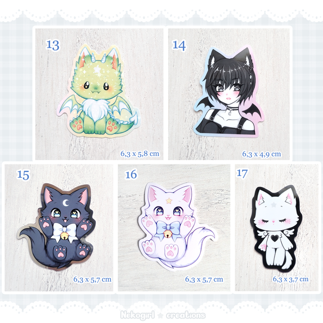 Autocollants en vinyle, illustrés par mes soins ! Veuillez vous référer aux photos pour connaître les tailles. Ils sont résistants à l’eau et peuvent être utilisés pour décorer un carnet, ou être collés sur n'importe quelle autre surface (ordinateur portable, téléphone, gourde, frigo, etc...) ! ✧
