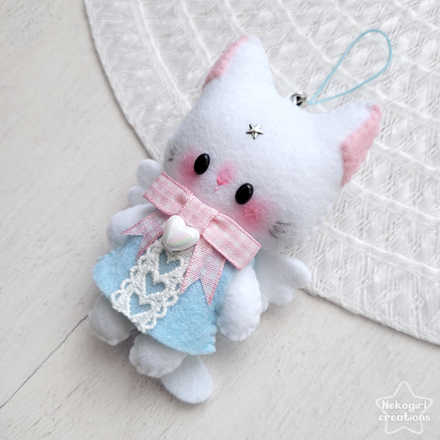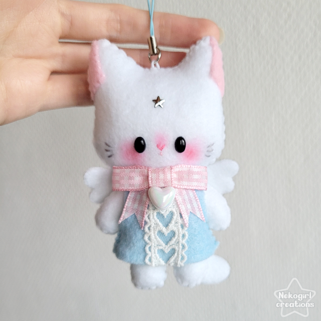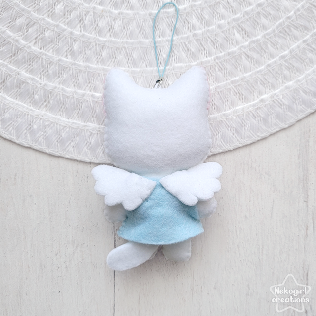 Petite peluche en feutrine d’un chat blanc aux ailes d'ange, designée par moi, entièrement faite et cousue à la main. ♡ Parfaite comme décoration unique sur un sac ou dans une chambre.